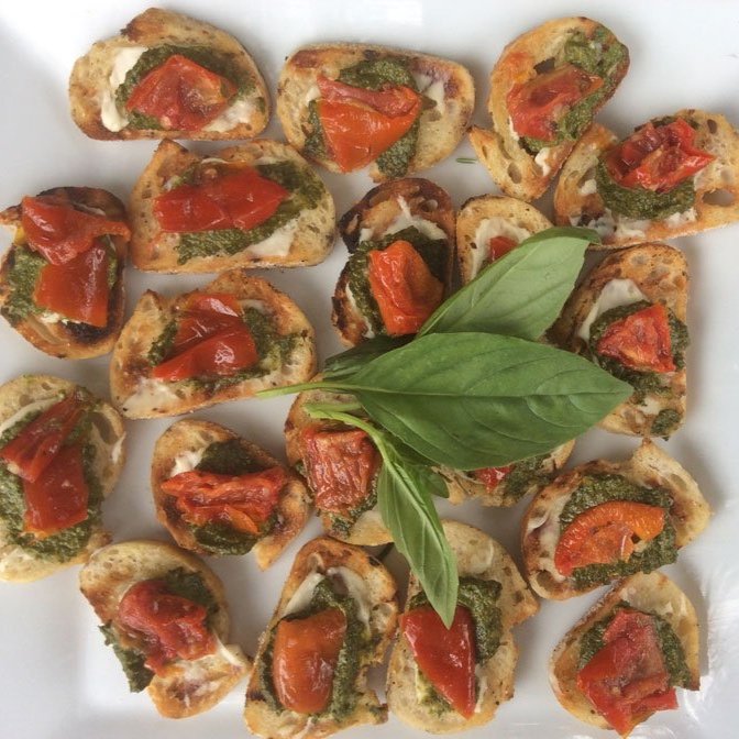 Oven Dried Tomato & Spinach Pesto Crostini - grilled with Boursin Cheese